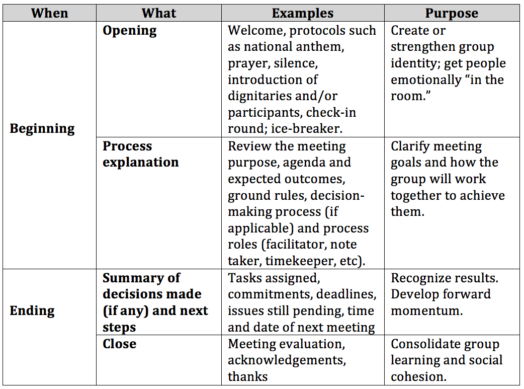 The issues to discuss or decide are only one part of an effective agenda. Time is also needed to open and close the meeting. Dedicating 5-10% of overall meeting time to each of these aspects can greatly enhance the success of the meeting.