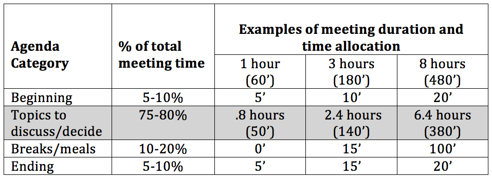 These guidelines are intended to provide agenda planners with a starting point for designing meetings that both satisfy the organization’s needs and leave participants feeling that their time was well used.