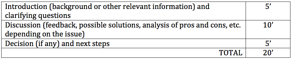 Start by determining the duration of the meeting. Be realistic! If you know that in your context meetings typically start 20 minutes later than the announced time, consider that when planning the agenda.